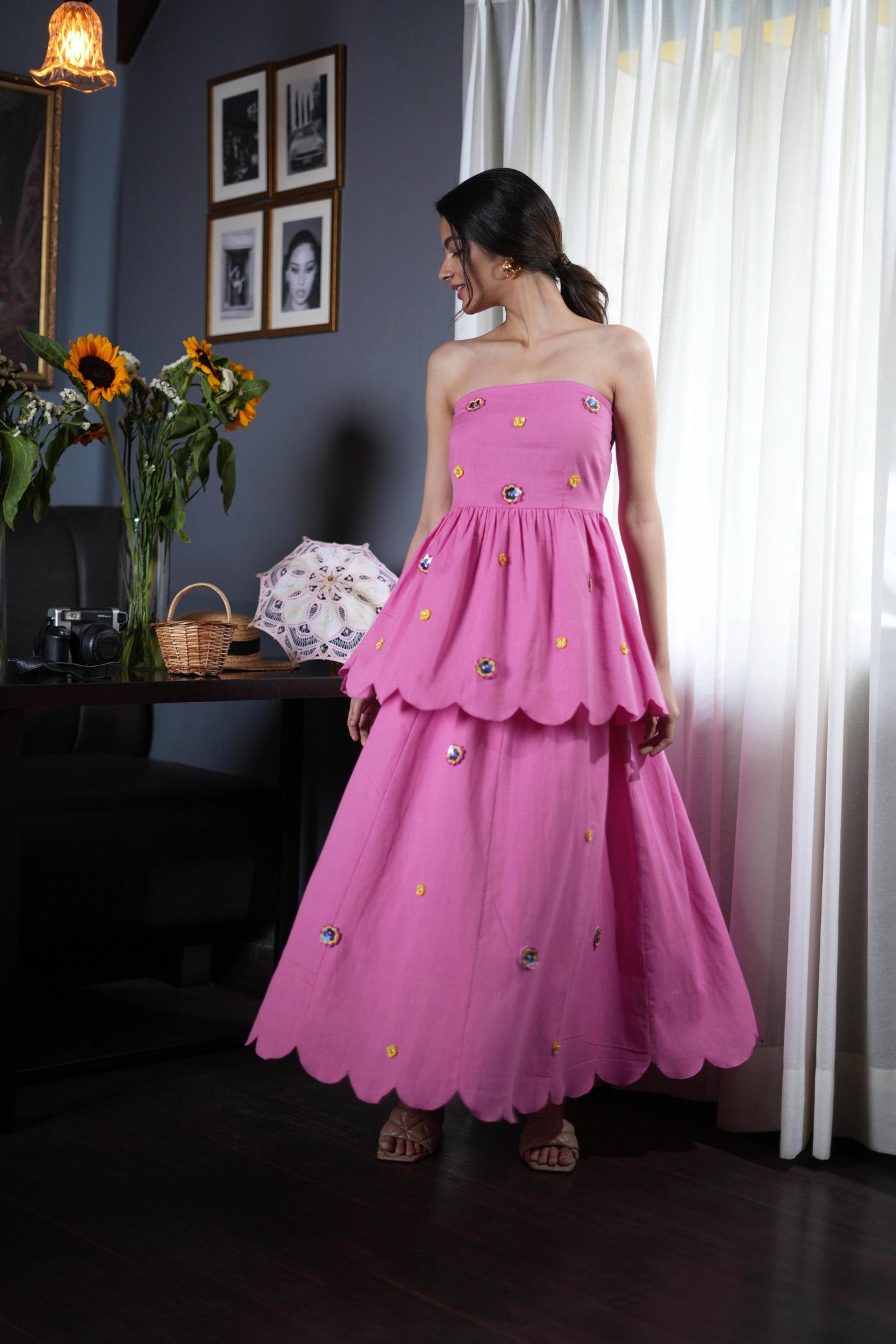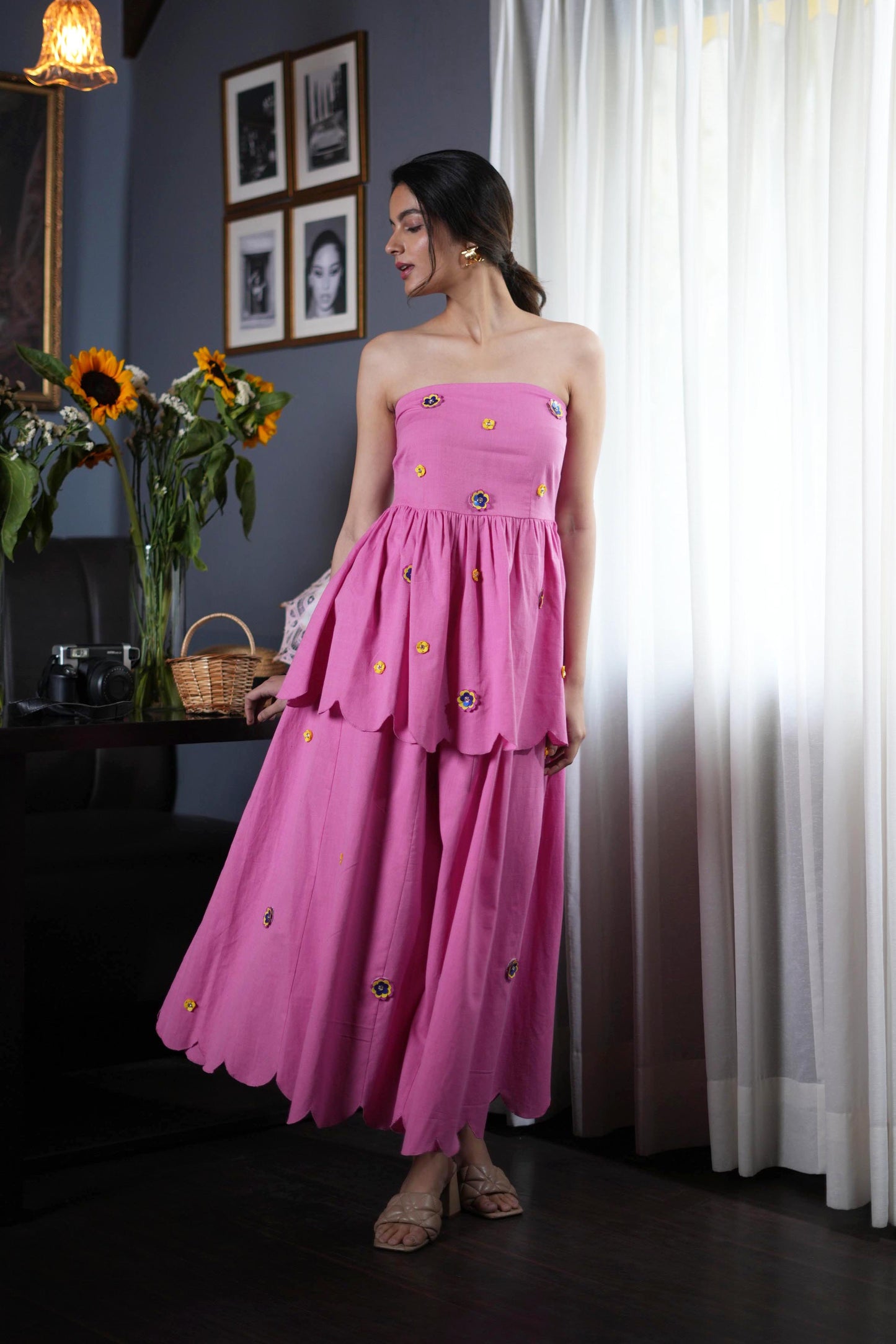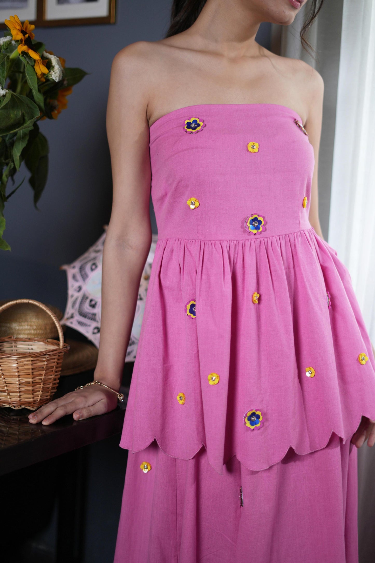 Twirl away in this adorable set! The scalloped hem top and the voluminous skirt makes it the perfect hot girl summer outfit. The cute flower embellishments scattered all over make us want to book our next holiday now!