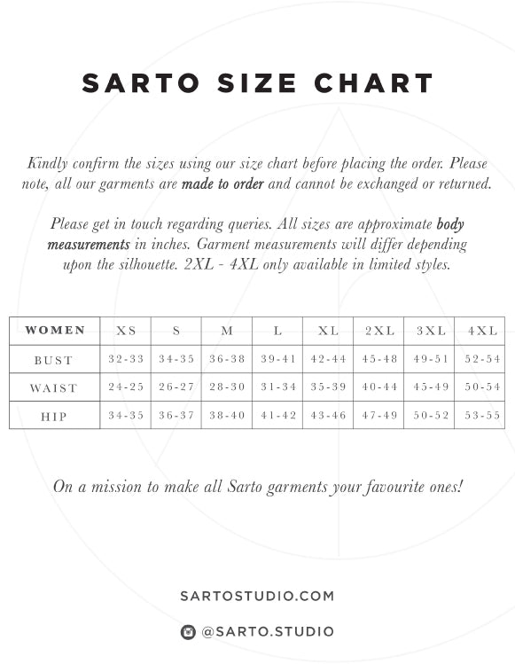 Please note, each garment has a different size depending upon the silhouette, designed to flatter all body shapes and sizes. Please refer to our size chart before confirming a size. All items are made to order and cannot be returned or exchanged.